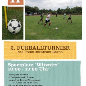 Dieses findet am 11. Juli auf dem Sportplatz "Witznitz" in Borna von 10 Uhr bis ca. 19 Uhr statt. Gespielt wird in zwei Altersgruppen (8-13 und 14-27 Jahre), Rasenplatz, Kleinfeld, jeweils 5 Feldspieler und ein Tormann.