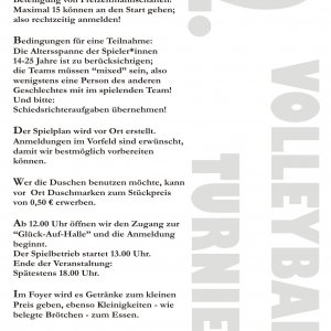 Bedingungen für eine Teilnahme: Die Altersspanne der Spieler*innen 14 - 25 Jahre ist zu berücksichtigen, die Teams müssen "mixed" sein; also wenigstens eine Person des anderen Geschlechtes mit im spielenden Team! Und bitte Schiedsrichteraufgaben mit übernehmen! Der Spielplan wird vor Ort erstellt, Anmeldungen im Vorfeld sind erwünscht, damit wir entsprechend vorbereiten können. Wer die Duschen benutzen möchte kann vor Ort Duschmarken zum Stückpreis von 0,50€ bekommen.