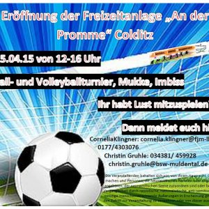 Nach langer Bauzeit möchten wir die ersten Elemente der Freizeitanlage in Colditz mit Euch eröffnen. Um in Aktion zu bleiben wollen wir ein Fußball- oder Volleyballturnier mit Musik und einem kleinen Imbiss organisieren. Habt ihr Lust bei einem der beiden Turniere dabei zu sein oder und bei der Organisation zu unterstützen? Dann meldet Euch entweder beim FJM in Bad Lausick oder einfach bei mir ;O)