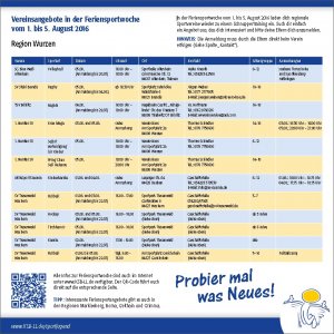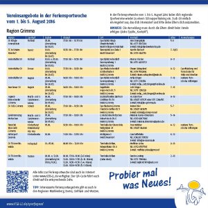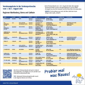 Unter diesem Motto laden die Vereine des Landkreises Leipzig in der Feriensportwoche, in der letzten Woche der Sommerferien (01.-05.08.16) Kids und junge Erwachsene ein, in verschiedene Sportarten reinzuschnuppern. Wolltest du schon immer mal Judo, Boule oder Inlineskating ausprobieren, bei einem Spielmannszug mitmachen oder Breakdance, Krav Maga, Karate oder Rugby lernen? Unsere Vereine haben viel zu bieten! Check den Flyer deiner Region oder hier. Einfach eine Sportart auswählen, rechtzeitig anmelden und reinschnuppern!