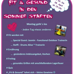 Wir machen uns mit euch fit für den Sommer. Euch erwarten ein gesünderes Imbissangebot und zusammen sporteln wir uns fit für die heißeste Zeit des Jahres. Außerdem laden wir euch zum gemeinsamen Köcheln mit frischen Zutaten ein, die wir anschließend gemeinsam genüßlich wegnaschen werden ;).