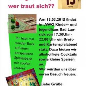 Am Freitag den 13. 03. Veranstalten wir einen Spieleabend mit verschieden Brett- und Kartenspielen, alkoholfreien Cocktails und präventiven Angebote zum Thema Alkohol und Drogen.