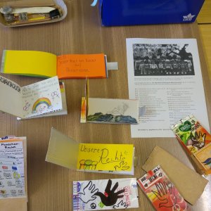 Am vergangenen Montag den 07. 05. fand der erfolgreiche erste Teil des Workshops statt, bei dem die Teilnehmer_innen neben viel theoretischen Input zu der Allgemeinen Erklärung der Menschenrechte und einer Diskussionsrunde selber ein Büchlein herstellten und gestalteten. Es entstanden viele verschiedene kleine Menschenrechtsbüchlein.